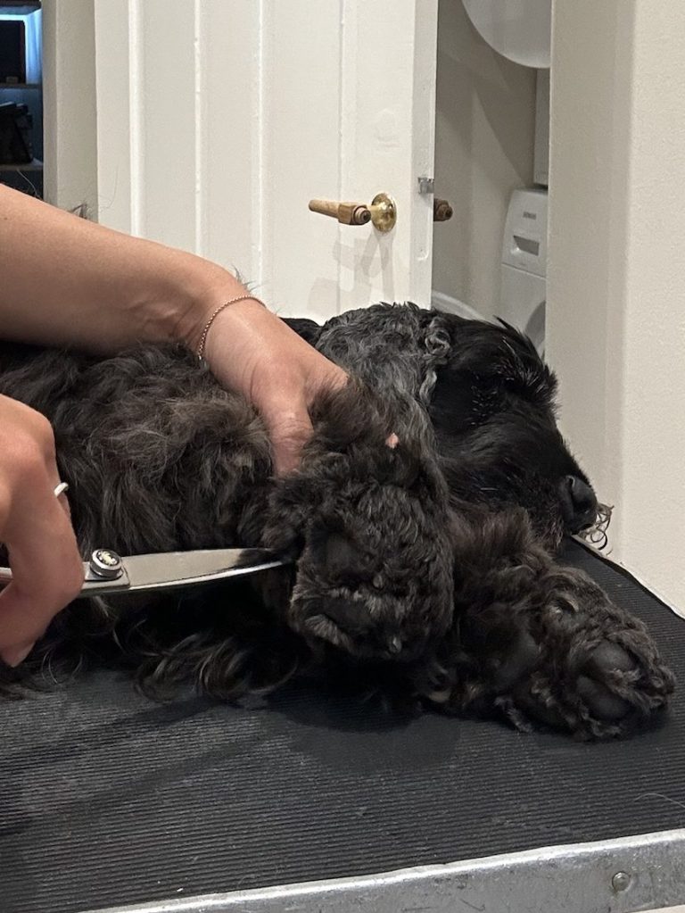 - I start of by clipping of the hair in between the paw pads. My ultimate tip for you here, is to lay your dog down on it’s side. This is so much more relaxing than if standing – both for you and the dog. If there is a lot of hair start of by clipping the hair in alignment with the paw pads, so you’ll be able to see what you are working with.