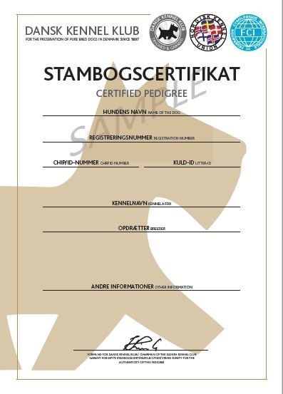 Here is what the pedigree from Dansk Kennel Klub looks like. Go to their webpage to read much more about why a DKK pedigree certificate is recommend (DKK webpage)